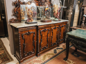 • 19th Century, Carved Rosewood Break Front, 4 Door Cabinet with Carrera Marble Top, Ex. Cork