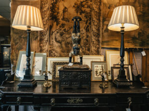 Antique Tapestry flanked by Gilt Chairs