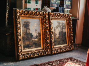 Pair of Early 19th Century Carved Gilt Wood Framed Oil Painting of Landscapes