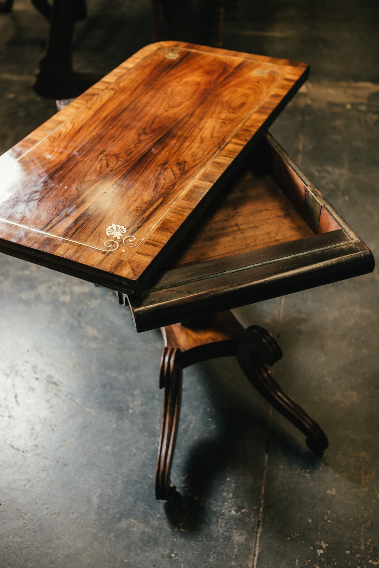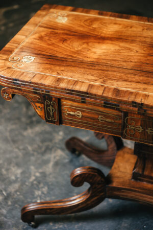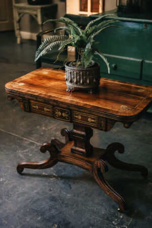 / Irish 19th Century Rosewood and Inlay Brass Fold Over Tea Table