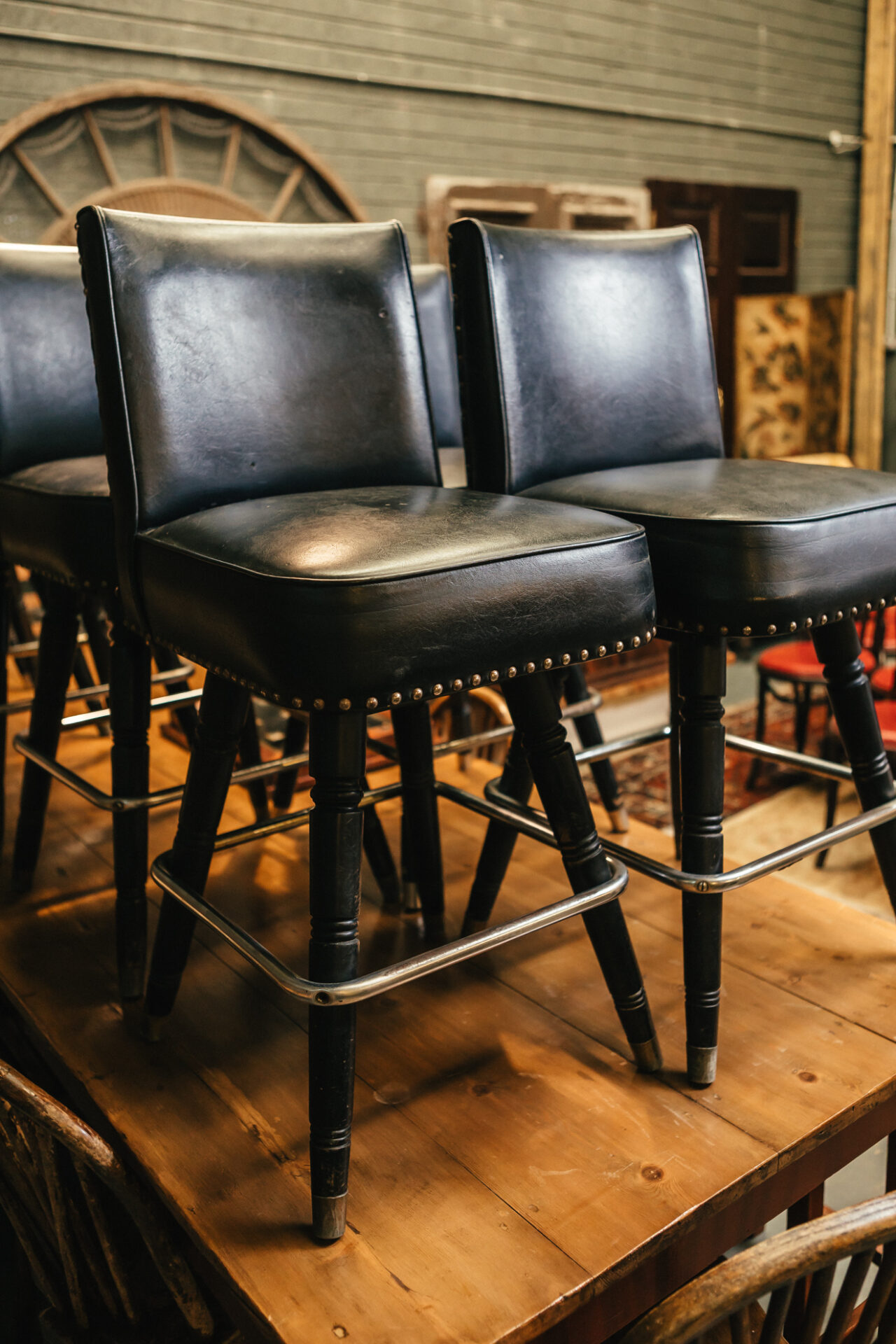 / Mid Century Black Leather Bar Stools
