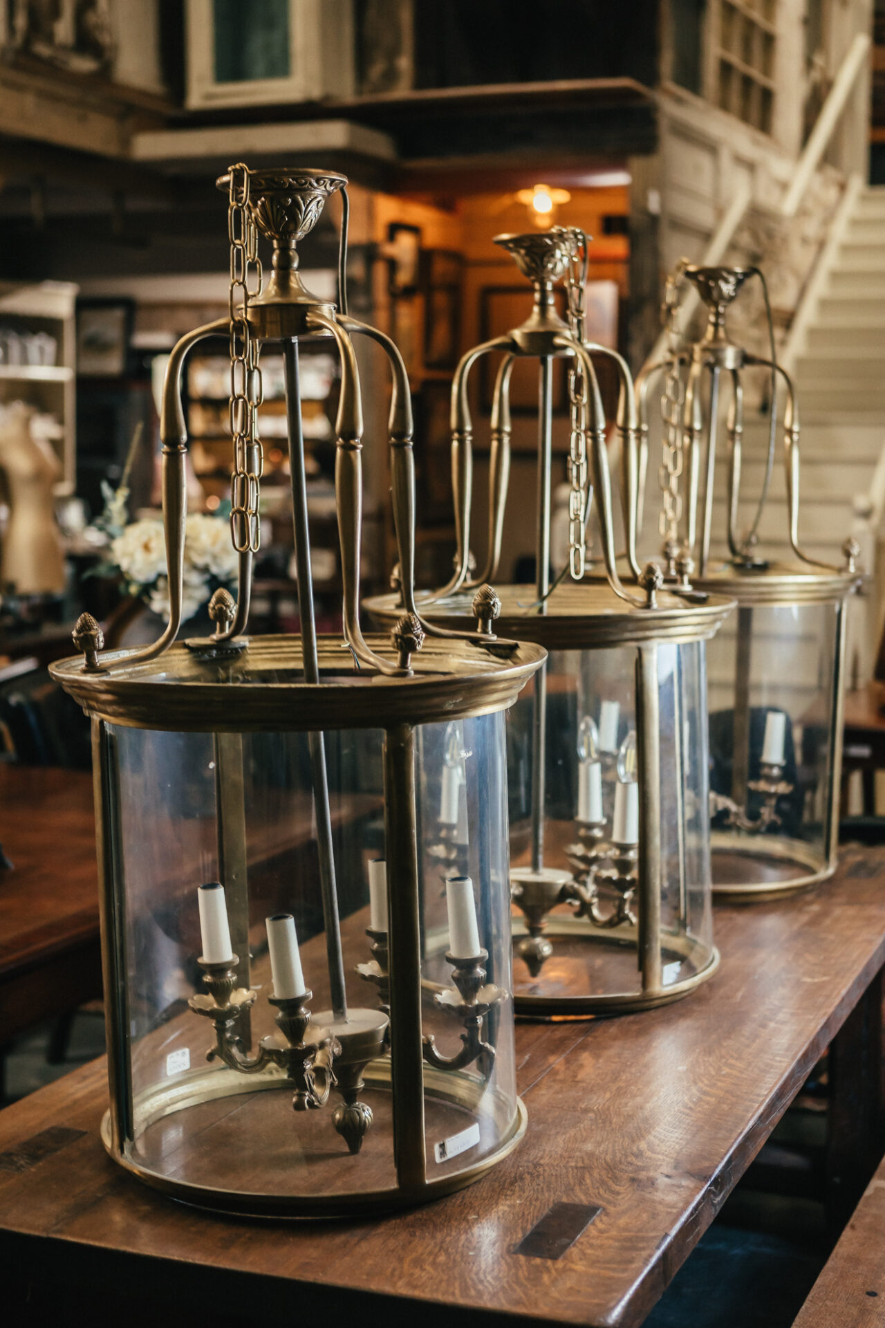 / Set of 3 Monumental Brass Glazed Cylindrical Hall Lanterns